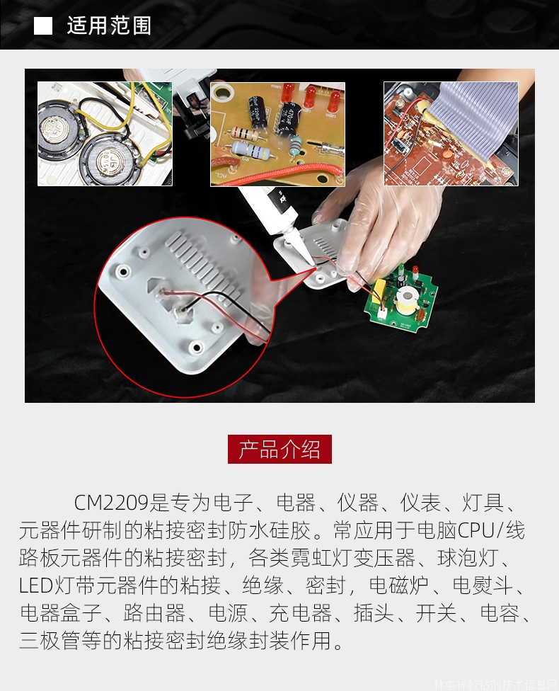 CM2209是專為電子、電器、儀器、儀表、燈具、元器件研制的粘接密封防水硅膠。常應(yīng)用于電腦CPU/線路板元器件的粘接密封,各類霓虹燈變壓器、球泡燈、LED燈帶元器件的粘接、絕緣、密封,電磁爐、電熨斗、電器盒子、路由器、電源、充電器、插頭、開關(guān)、電容、三極管等的粘接密封絕緣封裝作用。