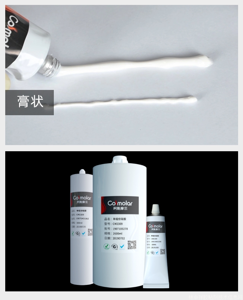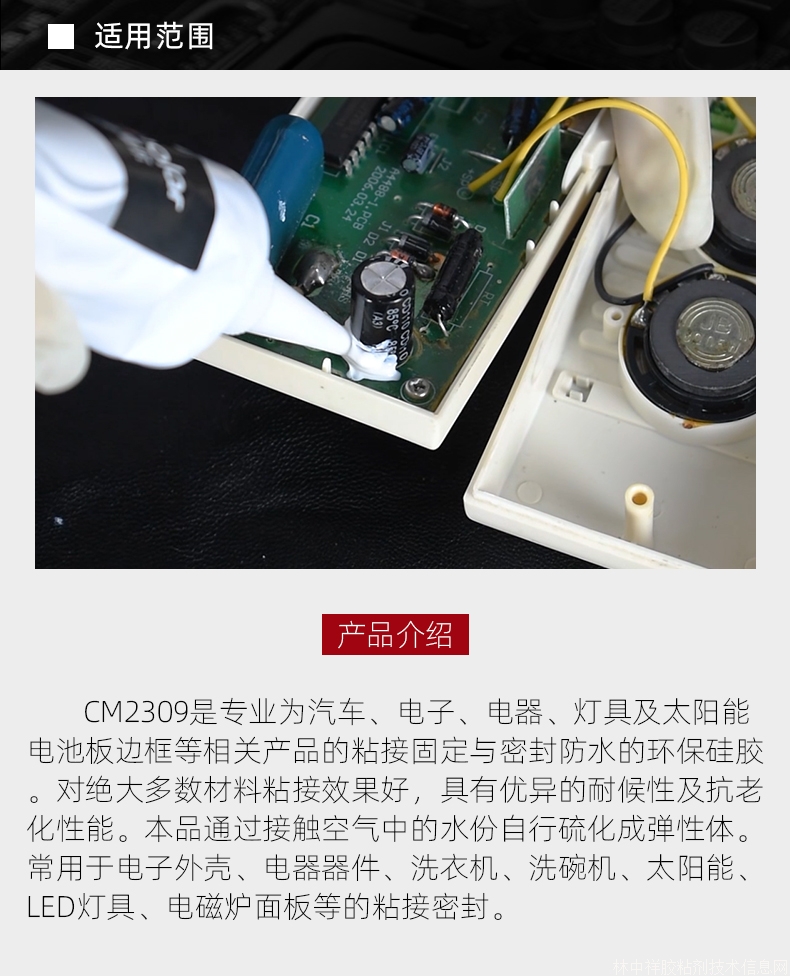 CM2309是專業為汽車、電子、電器、燈具及太陽能電池板邊框等相關產品的粘接固定與密封防水的環保硅膠。對絕大多數材料粘接效果好,具有優異的耐候性及抗老化性能。本品通過接觸空氣中的水份自行硫化成彈性體。常用于電子外殼、電器器件、洗衣機、洗碗機、太陽能、LED燈具、電磁爐面板等的粘接密封。