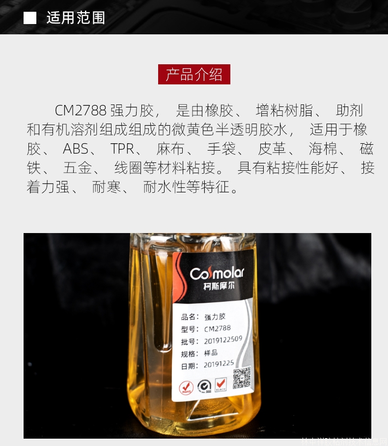 CM2788 強(qiáng)力膠,是由橡膠、增粘樹脂、助劑和有機(jī)溶劑組成組成的微黃色半透明膠水,適用于橡膠、ABS、TPR、麻布、手袋、皮革、海棉、磁鐵、五金、線圈等材料粘接。具有粘接性能好、接著力強(qiáng)、耐寒、耐水性等特征。