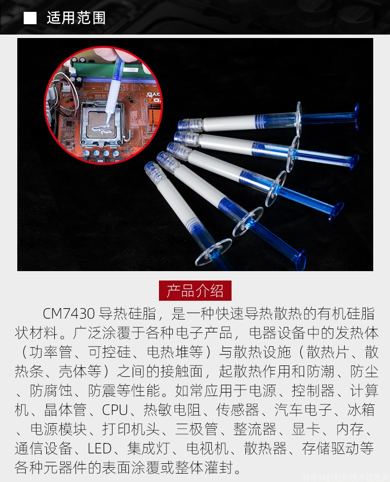 CM7430 導熱硅脂,是一種快速導熱散熱的有機硅脂狀材料。廣泛涂覆于各種電子產品,電器設備中的發熱體 (功率管、可控硅、電熱堆等)與散熱設施(散熱片、散熱條、殼體等)之間的接觸面,起散熱作用和防潮、防塵、防腐蝕、防震等性能。如常應用于電源、控制器、計算機、晶體管、CPU、熱敏電阻、傳感器、汽車電子、冰箱、電源模塊、打印機頭、三極管、整流器、顯卡、內存、通信設備、LED、集成燈、電視機、散熱器、存儲驅動等各種元器件的表面涂覆或整體灌封。
