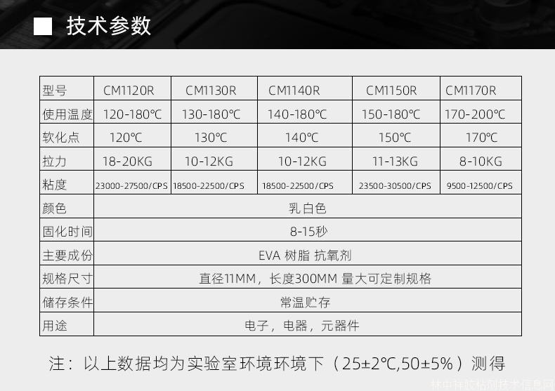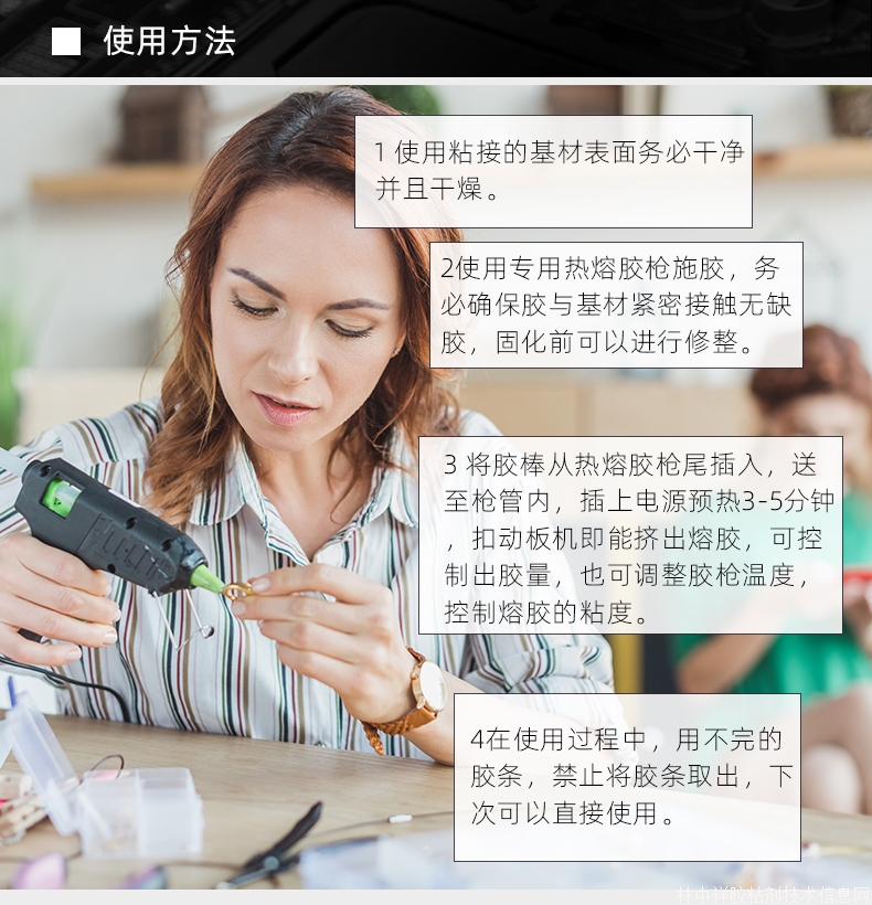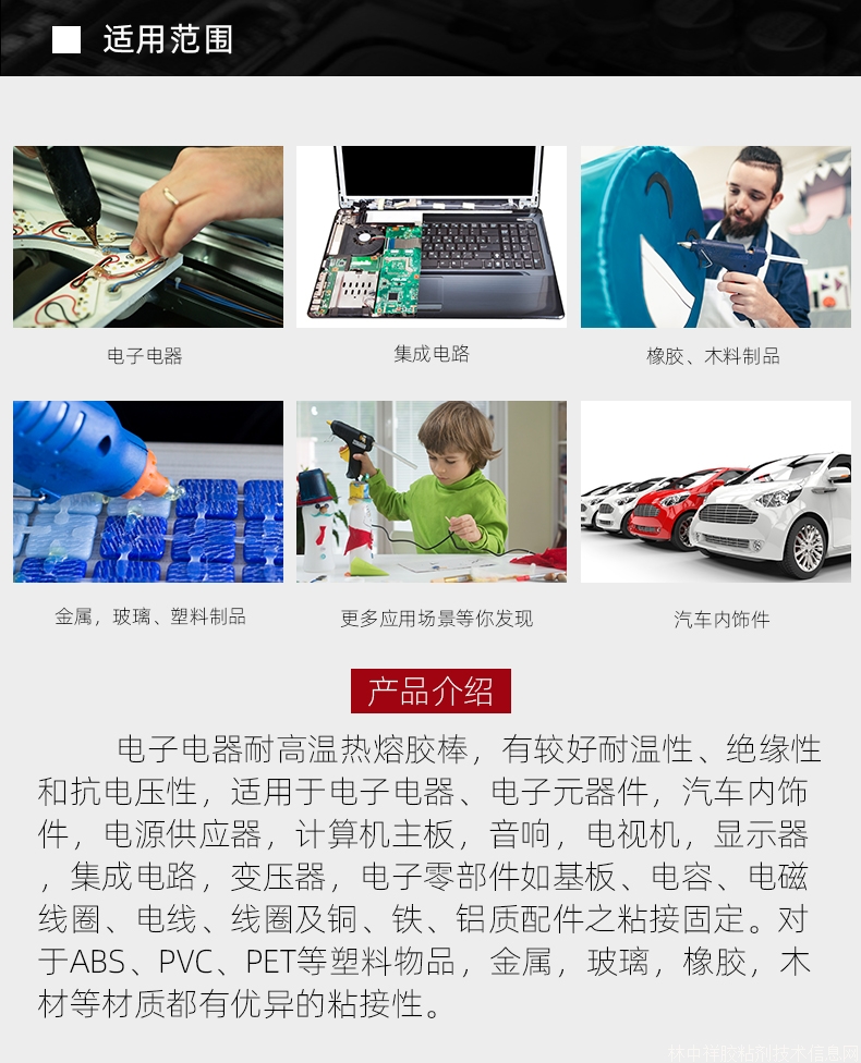 電子電器耐高溫熱熔膠棒,有較好耐溫性、絕緣性和抗電壓性,適用于電子電器、電子元器件,汽車內飾件,電源供應器,計算機主板,音響,電視機,顯示器,集成電路,變壓器,電子零部件如基板、電容、電磁線圈、電線、線圈及銅、鐵、鋁質配件之粘接固定。對于ABS、PVC、PET等塑料物品,金屬,玻璃,橡膠,木材等材質都有優異的粘接性。