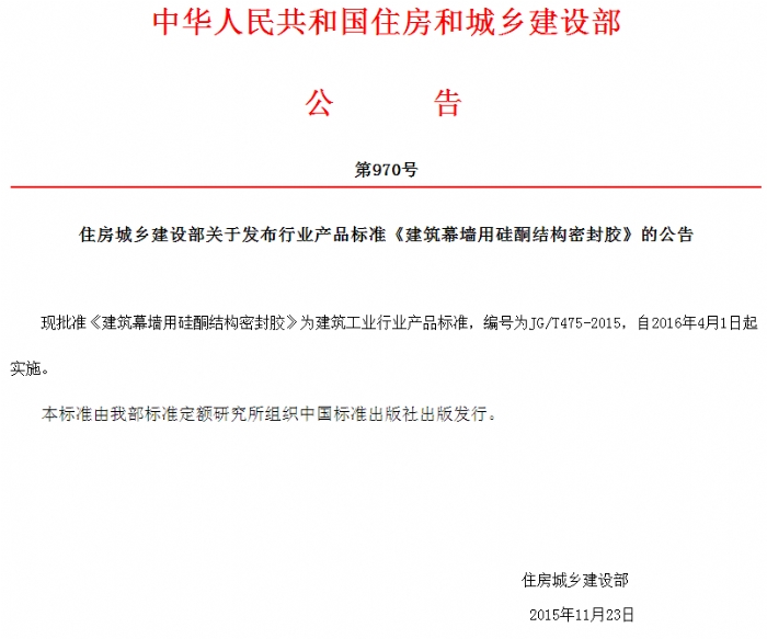 2015年11月23日住房城鄉建設部關于發布行業產品標準《建筑幕墻用硅酮結構密封膠》的公告,此公告批準《建筑幕墻用硅酮結構密封膠》為建筑工業行業產品標準,編號為JG/T475-2015,自2016年4月1日起實施。具體官方文件內容如下: