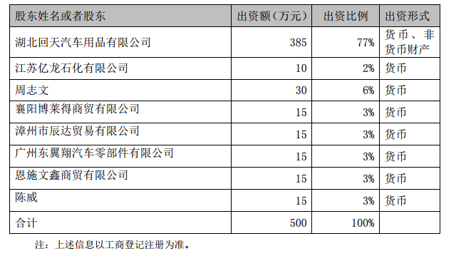 出資方式:回天汽用以自有貨幣資金或實物等非貨幣財產出資 385 萬元,出資比例 77%, 1 家供應商出資 10 萬元,出資比例 2%,6 家經銷商合計出資 105萬元,出資比例 21%。具體出資情況如下: