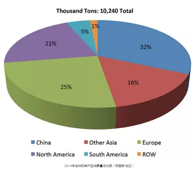 巴西則是南美和中美洲國家膠類產品的主要消費國,占到了該地區膠類產品消費總量的60%以上。預計巴西膠類產品消費量在今后幾年的年增長率會與該地區持平并放緩,為5%。下圖按地區分布顯示了膠類產品的全球消費量份額。