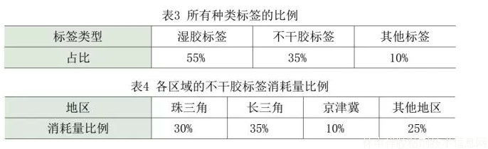 目前國內的不干膠涂布行業所面臨的最大問題就是產能過剩,企業間競爭激烈,利潤低。我國不干膠標簽所占比例,以及不同地區的不干膠需求比例見表3、表4。