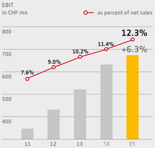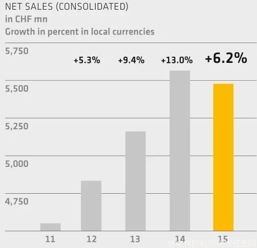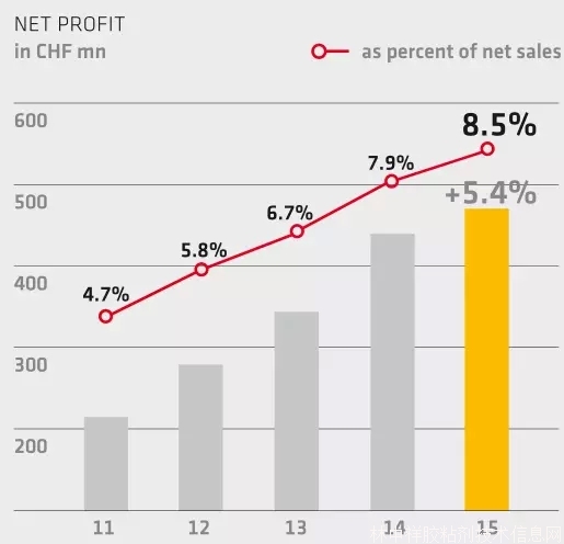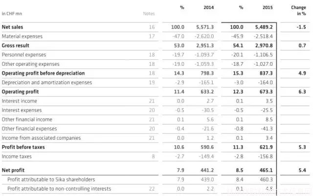 近日,世界防水材料巨頭西卡(Sika)發布了2015年度報告,按當地貨幣計算,西卡全球2015年銷售額同比增長6.2%,達54.892億瑞士法郎,約人民幣360.36億元;息稅前利潤為6.733億瑞士法郎,同比增長12.3%;凈利潤為4.651億瑞士法郎,同比增長8.5%。