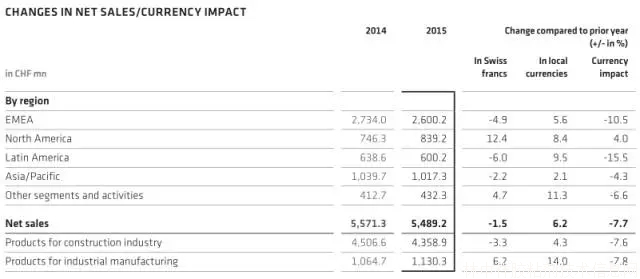 報告稱,2015年西卡全球所有地區都取得了顯著的銷售增長和市場份額的增長,其中美國、墨西哥、非洲、中東、東南亞和太平洋等核心市場取得了兩位數的增長。以累計計算和按固定匯率計算,累計銷量增加了6.2%。剔除中國市場的負增長,銷售額增長了7.4%。