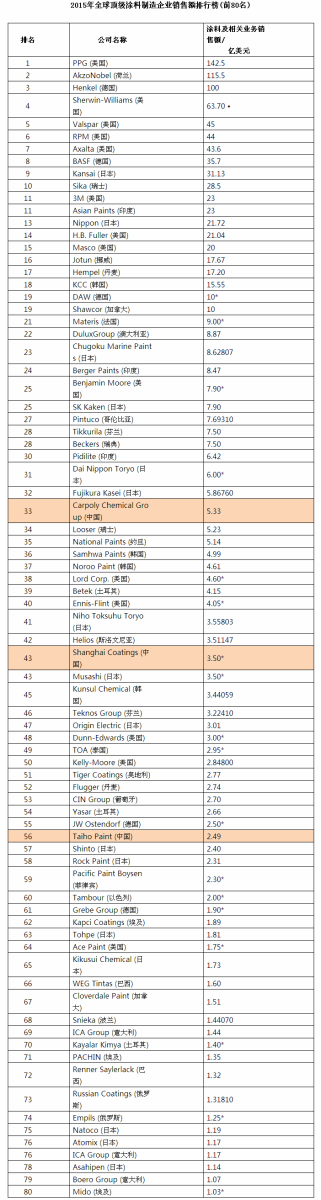 本次中國上榜企業分別為:33名,廣東嘉寶莉化工集團有限公司,銷售額5.33億美元;43名,上海涂料有限公司,銷售額3.50億美元;56名,大寶漆,銷售額2.49億美元。