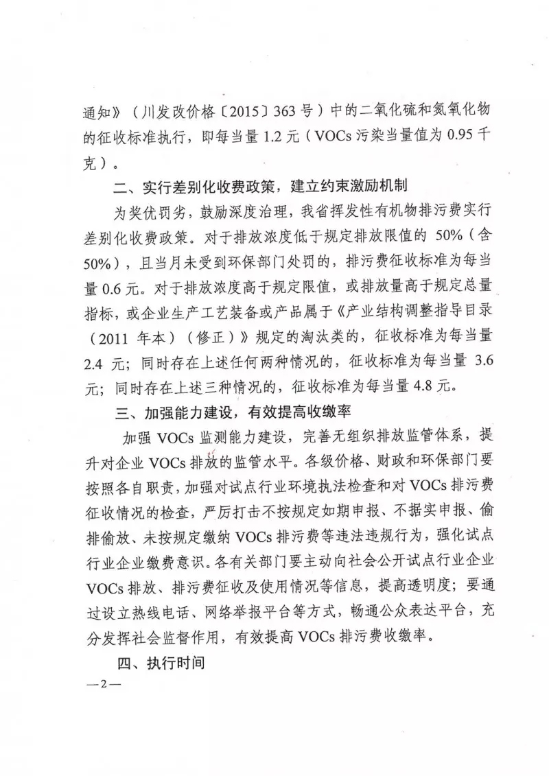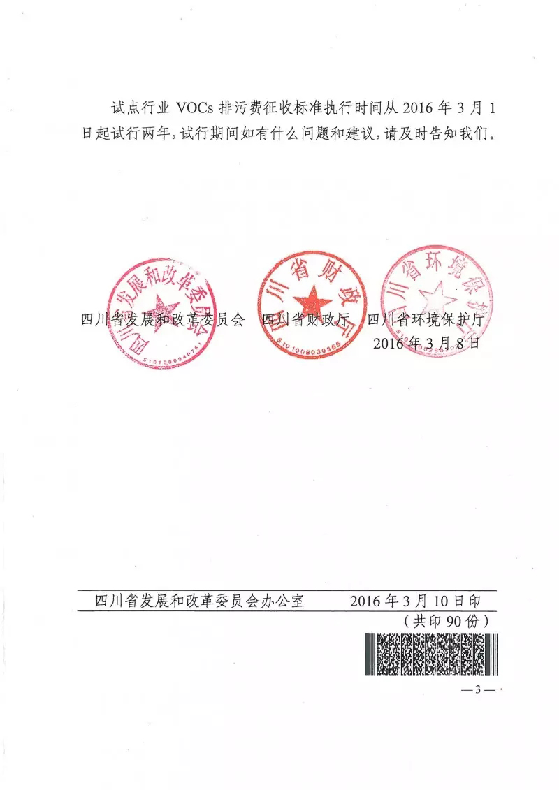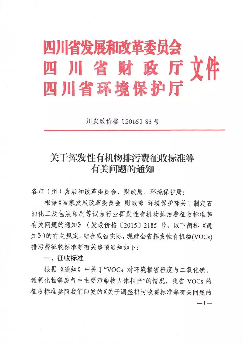 近日,從四川省發改委獲悉,《四川省發展和改革委員會 四川省財政廳四川省環境保護廳關于揮發性有機物排污費征收標準等有關問題的通知》已經下發。繼北京市、上海市、江蘇省、安徽省和湖南省開征揮發性有機物VOCs排污費之后,四川省成為全國第六個省份、正式發布文件通知試點開征VOCs排污費,從2016年3月1日起執行。具體內容如下: