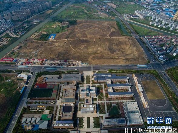 常州外國(guó)語(yǔ)學(xué)校以及馬路對(duì)面的“化工污染地”(4月18日攝)。新華社記者李響攝