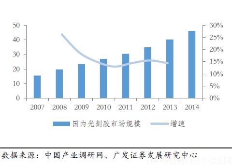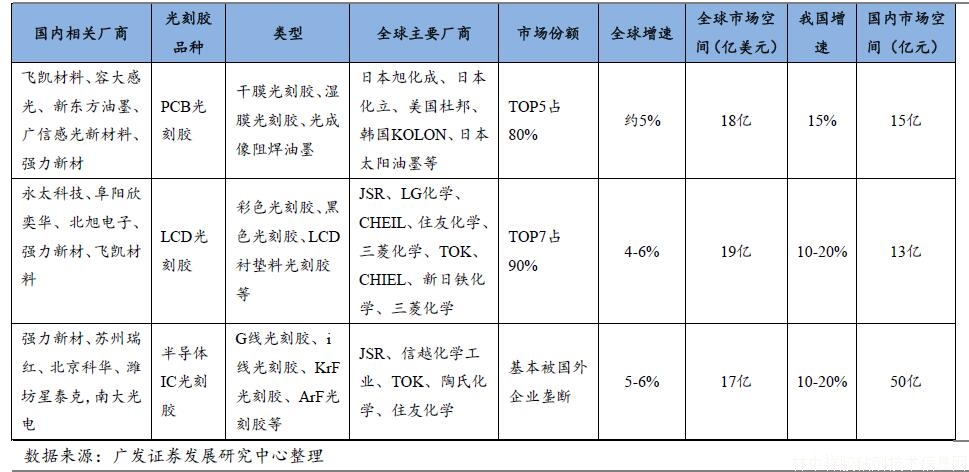 整體來看,我國進口光刻膠占據國內87%的市場份額,自給率低。而國內光刻膠受益于半導體產業轉移及國內電子化學品的迅速發展,需求增速遠高于全球,國內從事光刻膠研發和生產的單位主要有北京科華微電子材料有限公司和蘇州瑞紅電子化學品有限公司,上市公司中飛凱材料、強力新材等企業將有望率先實現技術突破,抓住歷史發展機遇。