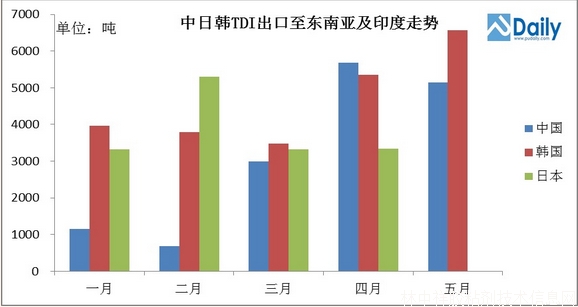 自從三月下旬三井大牟田裝置停車以來,日本TDI出口大幅下降,環(huán)比降幅達(dá)37.35%。后期,三井通過從韓國韓華調(diào)貨,緩解了部分供貨壓力。另外,官方消息稱,其位于鹿島的11.7萬噸/年TDI裝置于5月份永久關(guān)停。最新消息,三井位于大牟田的12.8萬噸/年裝置將于本周重啟,如果成功,東南亞TDI市場將從頂峰進(jìn)入新的拐點,而鑒于其產(chǎn)能下降將近一半,對市場沖擊力預(yù)計將會減小。