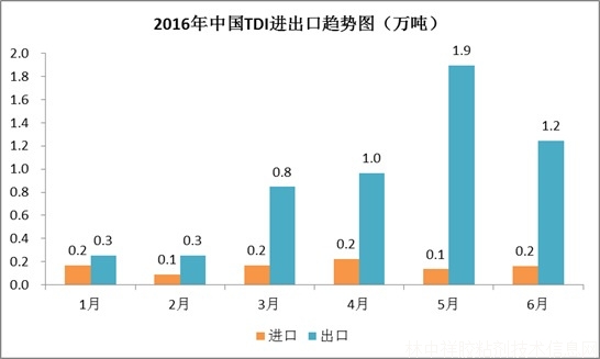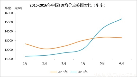 國內TDI市場在2016年上半年猶如過山車般經歷了大起大落。1-3月,市場延續2015年末的弱勢,價格長期在11000-12000元/噸徘徊。從3月末起,由于日本三井大牟田TDI裝置故障,TDI限量供應,TDI美金價格一路高漲,加上從4月起,市場開始逐步進入需求旺季,國內TDI價格也開始跟漲。隨著國外TDI貨源供應緊缺的深入,國內工廠TDI出口大幅提升,加上國內一些工廠的停車檢修,國內TDI貨源同樣告急,刺激國內TDI價格接連大漲,至5月中旬起更開啟了一周瘋漲1000元/噸的模式,至6月初,市場價格更是達到高點至16000-17000元/噸。隨著6月的深入,市場開始進入傳統消費淡季,且國外市場TDI需求也開始減少,受多重利空影響,國內TDI價格開始走跌,截止6月底,市場主流價格趨于14500-15400元/噸,較6月初的高點價格下跌1500-1600元/噸,較年初上漲3300-3600元/噸。