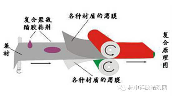復(fù)合聚氨酯膠粘劑專指分子鏈中含有氨酯基(-NHCOO-)或異氰酸酯基(-NCO)類的膠粘劑,主要用于將兩種或以上不同或相同性質(zhì)的膜狀、片狀材料粘接,形成新復(fù)合材料的膠粘劑。原理見下圖: