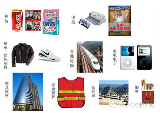 、侔凑沼猛究梢苑譃椋喊b、皮革、紡織制鞋、印刷、交通運(yùn)輸、家電及電子產(chǎn)品、家具及建筑材料、安全防護(hù)、新能源用復(fù)合聚氨酯膠粘劑等;