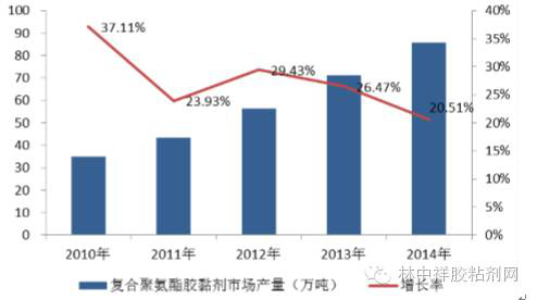 2009年以來,中國(guó)復(fù)合聚氨酯膠粘劑快速發(fā)展,產(chǎn)量以年均25%以上的速度持續(xù)增長(zhǎng)。2013年、2014年,中國(guó)復(fù)合聚氨酯膠粘劑行業(yè)產(chǎn)量分別達(dá)到71.2萬噸、85.8萬噸,維持良好的增長(zhǎng)勢(shì)頭。