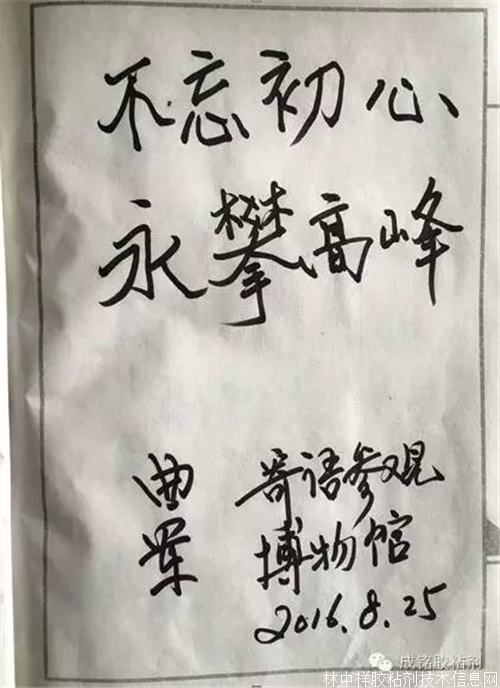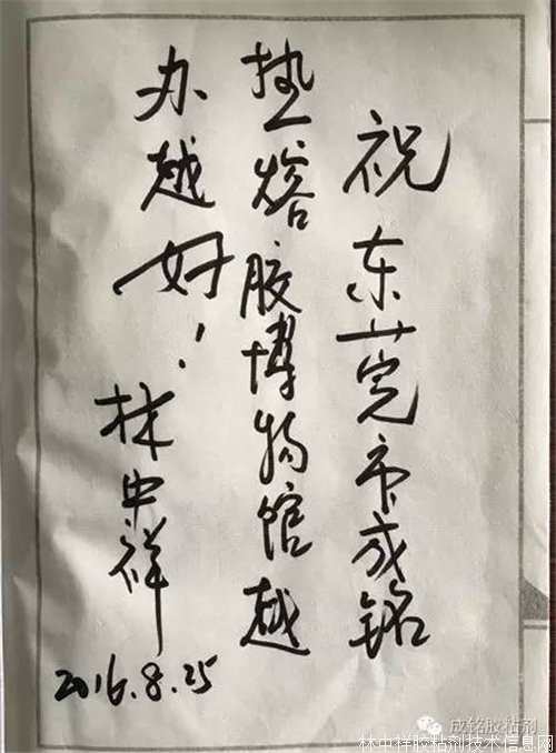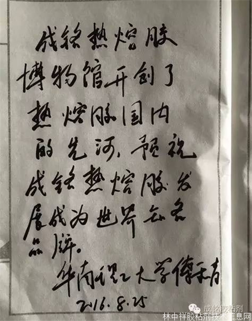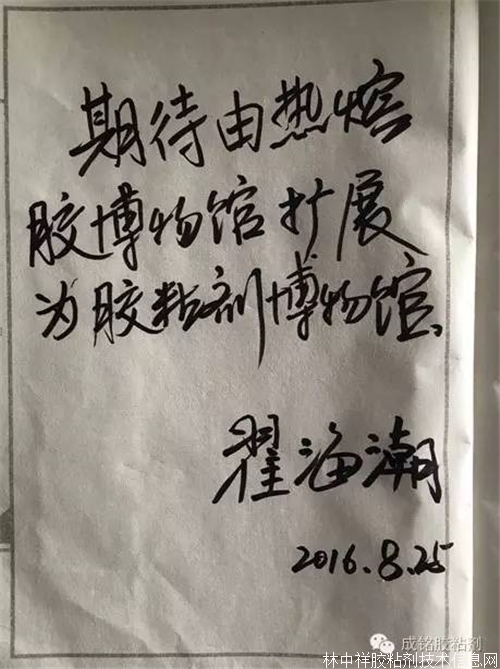 2016年8月25日,中國膠粘劑和膠粘帶行業年會剛剛在廣州落下帷幕,成銘科技園就迎來了西卡首席科學家曲軍博士、浙江大學范宏教授、上?颠_新材陸巍總經理、天山新材文人企業家翟海潮先生、南京林業大學林中祥教授、華南理工大學傅和青教授、亞利桑那化學石一峰博士、亞利桑那化學田建軍博士、萬事達膠帶熱熔膠應用專家程世君先生等一批中國膠粘劑行業知名的專家學者。據悉,專家學者們此行的目的是專程來參加成銘熱熔膠博物館答謝活動的。