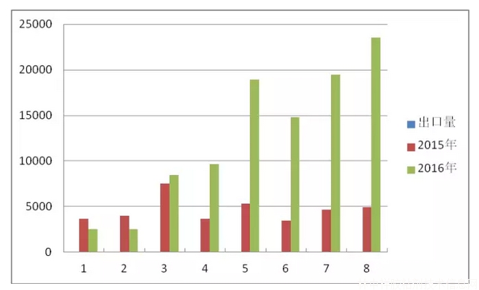 圖2 我國2016年1-8月與2015年同期TDI出口量對比圖(單位:噸)