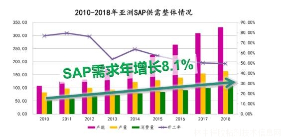 截至目前,亞洲SAP年產(chǎn)能約265萬(wàn)噸,產(chǎn)量140萬(wàn)噸,消費(fèi)量90萬(wàn)噸。