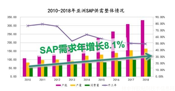 2012年-2016年,亞洲市場(chǎng)產(chǎn)能呈暴發(fā)態(tài)勢(shì)擴(kuò)增,整體開(kāi)工率由80%迅速降至50%附近,SAP供應(yīng)大于需求的格局加劇明顯;