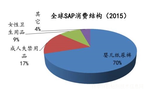 2015年,全球SAP消費(fèi)結(jié)構(gòu)主要包括嬰兒紙尿褲、成人失禁用品、女性衛(wèi)生巾及其它領(lǐng)域(醫(yī)療、農(nóng)林保水、工業(yè)防水、食品保鮮等),其中,嬰兒紙尿褲為最大消費(fèi)領(lǐng)域,消耗約70%SAP總量