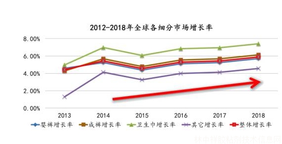 2012-2018年,全球嬰兒尿褲年增長(zhǎng)5.05%,成人尿褲年增長(zhǎng)5.36%,女性衛(wèi)生巾年增長(zhǎng)6.54%;