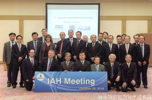 10月25日下午,第三屆國際膠粘劑協會領導人會議(IAH Meeting)如期召開。美國膠粘劑和密封劑委員會(ASC)、歐洲膠粘劑制造商協會(FEICA)、中國膠粘劑和膠粘帶工業協會(CATIA)、日本膠粘劑工業協會(JAIA)、韓國膠粘劑工業協會(KAIA)、臺灣區合成樹脂接著劑工業同業公會(TSRAIA)共計38位代表參加。亞洲地區膠粘劑協會(ARAC)主席、日本膠粘劑工業協會(JAIA)理事長TakayukiNogawa先生首先向大家介紹了本屆世界膠粘劑大會(WAC 2016)的整體安排情況。同時,Takayuki Nogawa先生對各協會給予本屆WAC的組織安排與支持表示衷心的感謝。隨后,美國膠粘劑和密封劑委員會(ASC)、歐洲膠粘劑制造商協會(FEICA)和亞洲地區膠粘劑協會(ARAC)分別介紹其膠粘劑市場現狀和發展趨勢、環保與安全法規等內容。