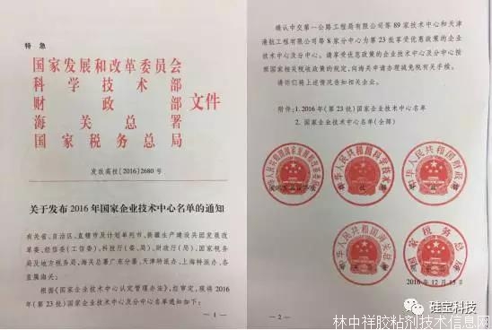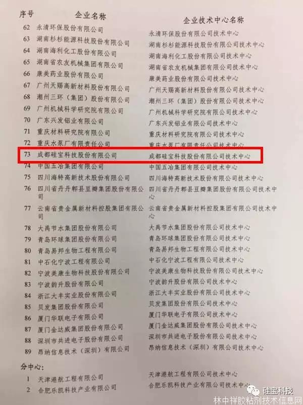 根據國家發展和改革委員會、科學技術部、財政部、海關總署、國家稅務總局聯合發布的2016年第2680號文件,成都硅寶科技股份有限公司技術中心被認定為“2016年(第23批)國家企業技術中心”。成都硅寶科技股份有限公司技術中心成為中國有機硅橡膠行業第一家、唯一一家國家企業技術中心。