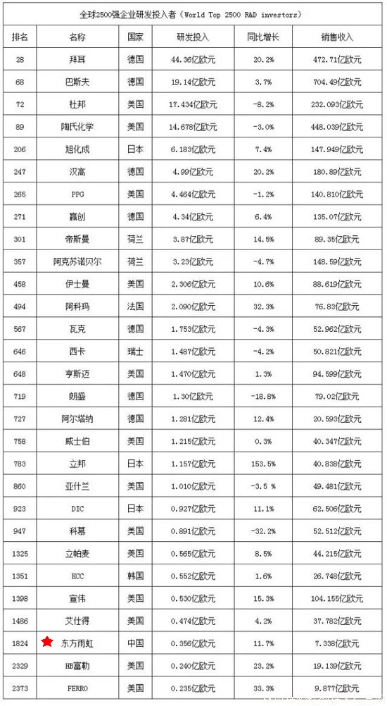榜單顯示,巴斯夫(BASF)、杜邦(DuPont)、陶氏化學(Dow)、PPG、阿克蘇諾貝爾(AkzoNobel)等化工企業上榜。東方雨虹以2015-2016財年3560萬歐元的研發投入上榜。