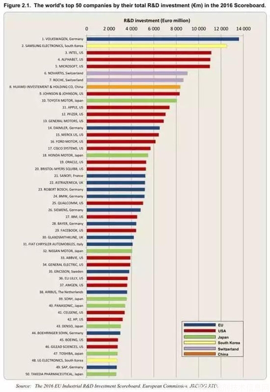 近日,歐盟委員會(European Commission)發布了“2016全球企業研發投入排行榜”(World Top 2500 R&Dinvestors)。該榜單調查統計了2015-2016財年全球2500家企業的研發費用總額,包含歐盟590家,美國837家,日本356家,中國327家,中國臺灣111家,韓國75家,瑞士58家。