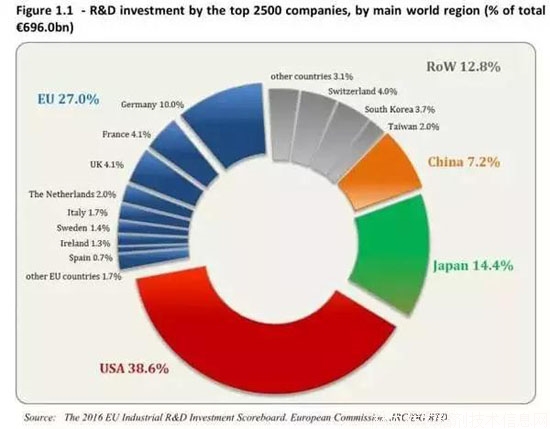 30家歐盟公司是世界100強研發投資者之一,主要在汽車、制藥和生物技術、ICT、航空航天和國防領域。最大的投資者分布在德國(688億歐元),法國(285億歐元),英國(282億歐元)和荷蘭(141億歐元)。