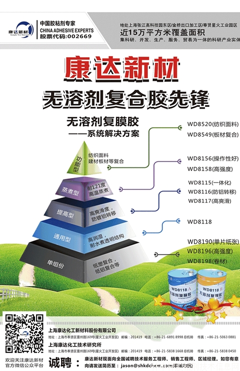 作為中國研發(fā)生產(chǎn)無溶劑膠粘劑的佼佼者之一,上海康達化工新材料股份有限公司2016年無溶劑復膜膠銷售收入預計突破1.2億元人民幣,同比2015增長60%~70%左右。