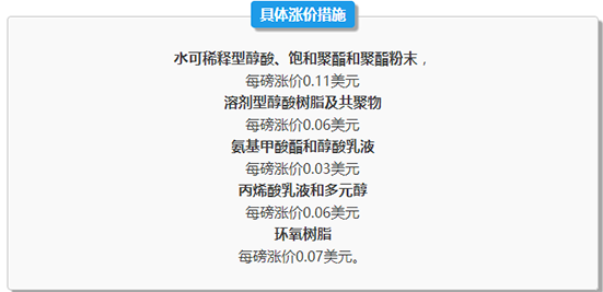 Reichhold公司宣布,將對公司出產(chǎn)的所有溶劑型醇酸樹脂、水稀釋型醇酸樹脂及共聚物、醇酸乳液、丙烯酸乳液、多元醇、聚氨酯、環(huán)氧樹脂、飽和聚酯和聚酯粉末涂料樹脂等產(chǎn)品進行漲價,本次漲價范圍適用于在美國和加拿大銷售的所有產(chǎn)品,涉及2017年3月20日當天或之后發(fā)貨的所有訂單。