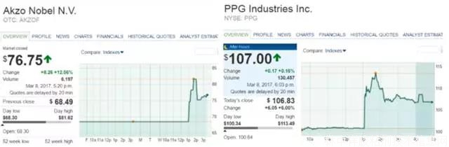 相關消息公布后,阿克蘇諾貝爾的美國股價上漲12%,目前市值超過170億美元;PPG股價收漲6%,當前市值約為260億美元。