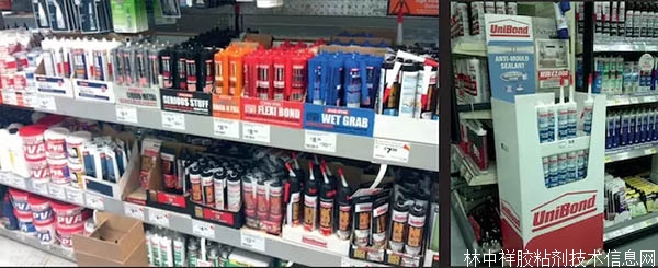 令人眼花繚亂的膠粘劑、密封劑貨架