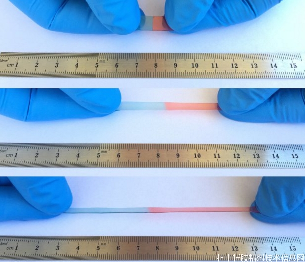 這種材料是由一種可延展的聚合物和一種離子鹽組成,形成了一種特殊的粘合力——離子偶極相互作用,是存在于帶電離子和極性分子之間的一種力。