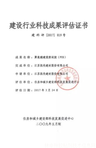2017年3月24日,住房和城鄉建設部科技發展促進中心在北京主持召開了由江蘇凱倫建材股份有限公司研發的“聚氨酯建筑密封膠PUS”科技成果評估會。