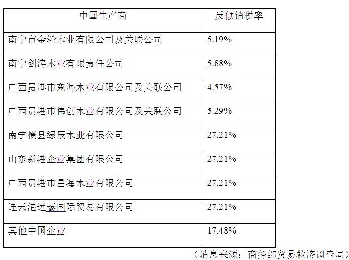 近日,韓國企劃財政部通報中方,經(jīng)過反傾銷日落復審調查,決定繼續(xù)對自中國進口的闊葉木膠合板產(chǎn)品(厚度大于6毫米,韓國海關稅號為4412.31,4412.33和4412.34)征收為期3年的反傾銷稅。中國膠合板企業(yè)稅率為4.57%—27.21%不等,詳見下表: