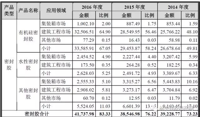 報告期內,對公司主營業務收入的貢獻度依次為有機硅密封膠、瀝青漆、其他密封膠、水性涂料和水性密封膠。