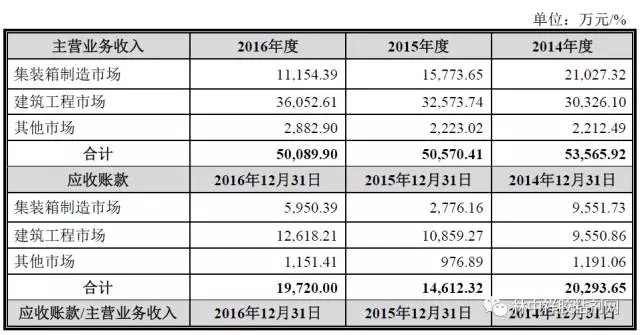 2014-2016年,集泰化工應收賬款分別為1.92億元、1.35億元、1.82億元,占當期流動資產的比例分別為59.79%、46.70%、59.71%。集泰化工解釋稱,主要系2016年10月集裝箱市場訂單量逐漸增加,而公司給予集裝箱客戶信用期較長,導致應收賬款大幅增加。