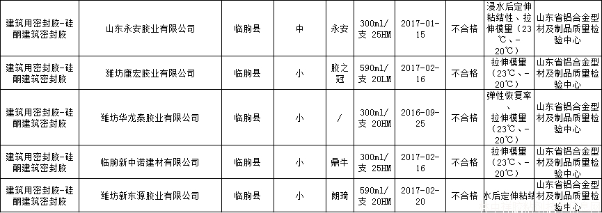 據濰坊市質量技術監督局官網2017年5月18日消息,2017年01月至04月,該局組織開展了第一批產品質量市監督抽查。本次共抽查了全市37家企業生產的70批次建筑用密封膠產品,有5家企業的5批次產品不符合相關標準的要求。