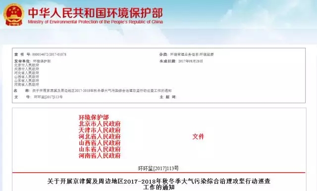 環境保護部會同北京、天津、河北、山西、山東和河南省(市)人民政府,制定《京津冀及周邊地區2017-2018年秋冬季大氣污染綜合治理攻堅行動巡查方案》(以下簡稱《巡查方案》)。現印發給你們,并就有關事項通知如下: