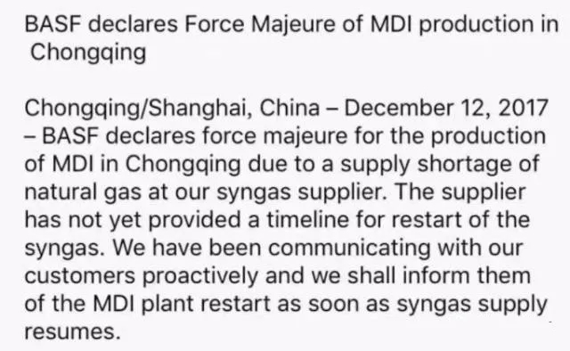 中國重慶/上海-2017年12月12日-巴斯夫宣布在重慶的MDI生產(chǎn)遇到不可抗力,原因是其合成氣供應(yīng)商的天然氣供應(yīng)短缺。該供應(yīng)商暫時(shí)沒有提供合成氣重啟的時(shí)間表。巴斯夫一直主動(dòng)和客戶保持溝通。一旦合成氣供應(yīng)回復(fù),巴斯夫?qū)⒘⒓粗貑DI裝置并通知客戶。