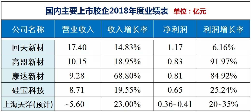 近日,康達新材、回天新材、高盟新材、硅寶科技等膠粘劑行業上市企業紛紛發布了2018年的年度業績報告(上海天洋暫未公布),詳情如下: