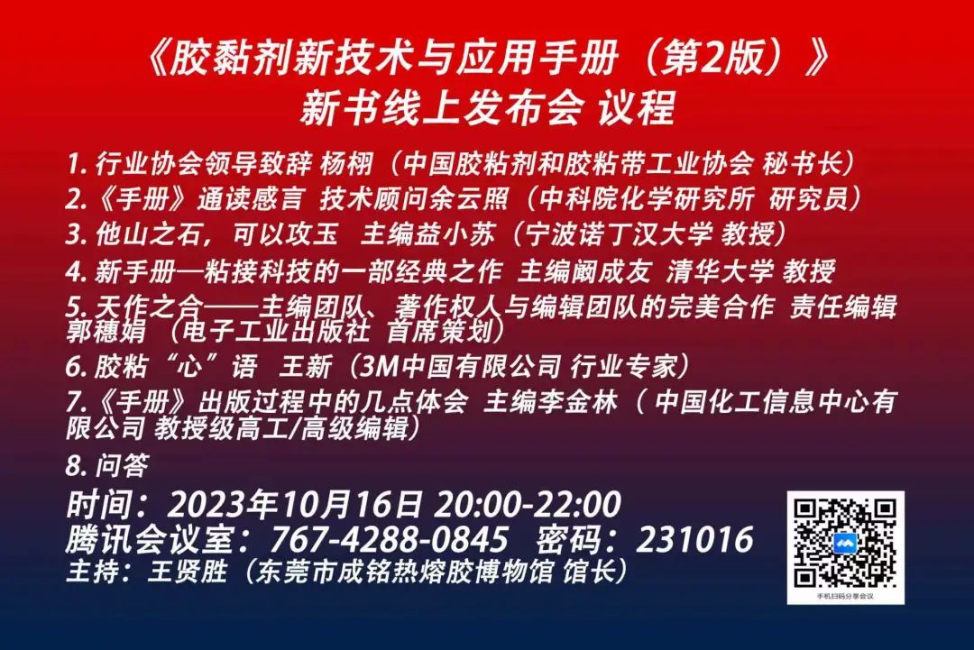 這本粘接科技巨著《膠黏劑新技術(shù)與應(yīng)用手冊(第2版)》的出版問世,將是中國粘接界和膠粘劑行業(yè)的一件大事、喜事!該書將于2023年10月16日舉辦新書線上發(fā)布會,歡迎廣大粘接科技從業(yè)人員積極參與,新書發(fā)布會的具體信息如下: