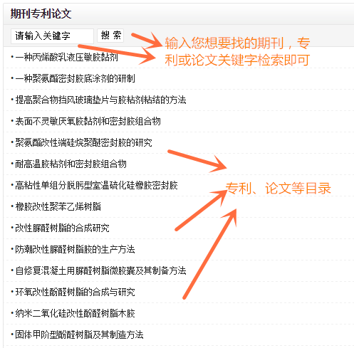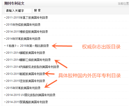 該版塊位于首頁(yè)中部位置。我們網(wǎng)站工作人員每天會(huì)定期整理上傳國(guó)內(nèi)外關(guān)于膠粘劑行業(yè)相關(guān)的專(zhuān)利目錄,期刊目錄,論文目錄等,具體專(zhuān)利論文等(參考下圖),便于大家檢索參考。輸入關(guān)鍵字,即可便捷找到您想要的信息。