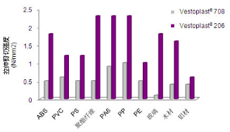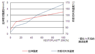圖3顯示了以Vestoplast®206替代部分標準等級(Vestoplast®708)產品時拉伸強度和熱剪切失效溫度的提高。