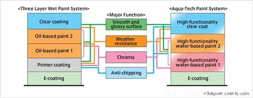 一是在現(xiàn)有涂裝工藝基礎(chǔ)上,開(kāi)發(fā)出功能性更強(qiáng)的全新涂料。馬自達(dá)給Aqua-tech涂裝系統(tǒng)帶來(lái)了兩種全新類別的頂級(jí)涂層涂料:水性著色底層涂料和氨基甲酸乙酯透明涂層涂料(第一次被日本汽車制造企業(yè)使用)。通過(guò)兩種創(chuàng)新涂料的應(yīng)用,揮發(fā)性有機(jī)化合物的排放量達(dá)到了行業(yè)內(nèi)最低的等級(jí),比三噴一烘涂裝工藝減少57%,比普通水性涂裝系統(tǒng)降低50%。