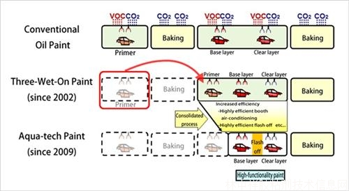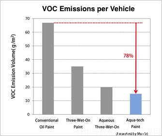 通過(guò)“三噴一烘(Three Layer Wet Paint System,即中層噴涂、上層噴涂和上光工序集于一體的涂裝工藝)”涂裝技術(shù)的應(yīng)用,馬自達(dá)已經(jīng)獲得了世界領(lǐng)先的低二氧化碳排放量等級(jí)。之后馬自達(dá)公司把研發(fā)目標(biāo)放在了,如何使得揮發(fā)性有機(jī)化合物的排放也達(dá)到世界領(lǐng)先水準(zhǔn)。