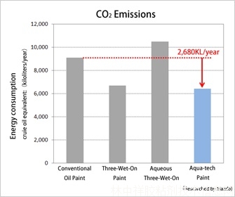 相比于傳統(tǒng)溶劑型涂料,水性涂料含有的揮發(fā)性有機(jī)化合物總量較少,因此有助于降低揮發(fā)性有機(jī)化合物的排放。但是水作為稀釋液,必須利用干燥處理工藝進(jìn)行蒸發(fā),整個(gè)過(guò)程會(huì)消耗大量的電能。與之相關(guān)的上游發(fā)電過(guò)程會(huì)產(chǎn)生大量的二氧化碳,遠(yuǎn)遠(yuǎn)超過(guò)溶劑型涂裝系統(tǒng)造成的排放量。